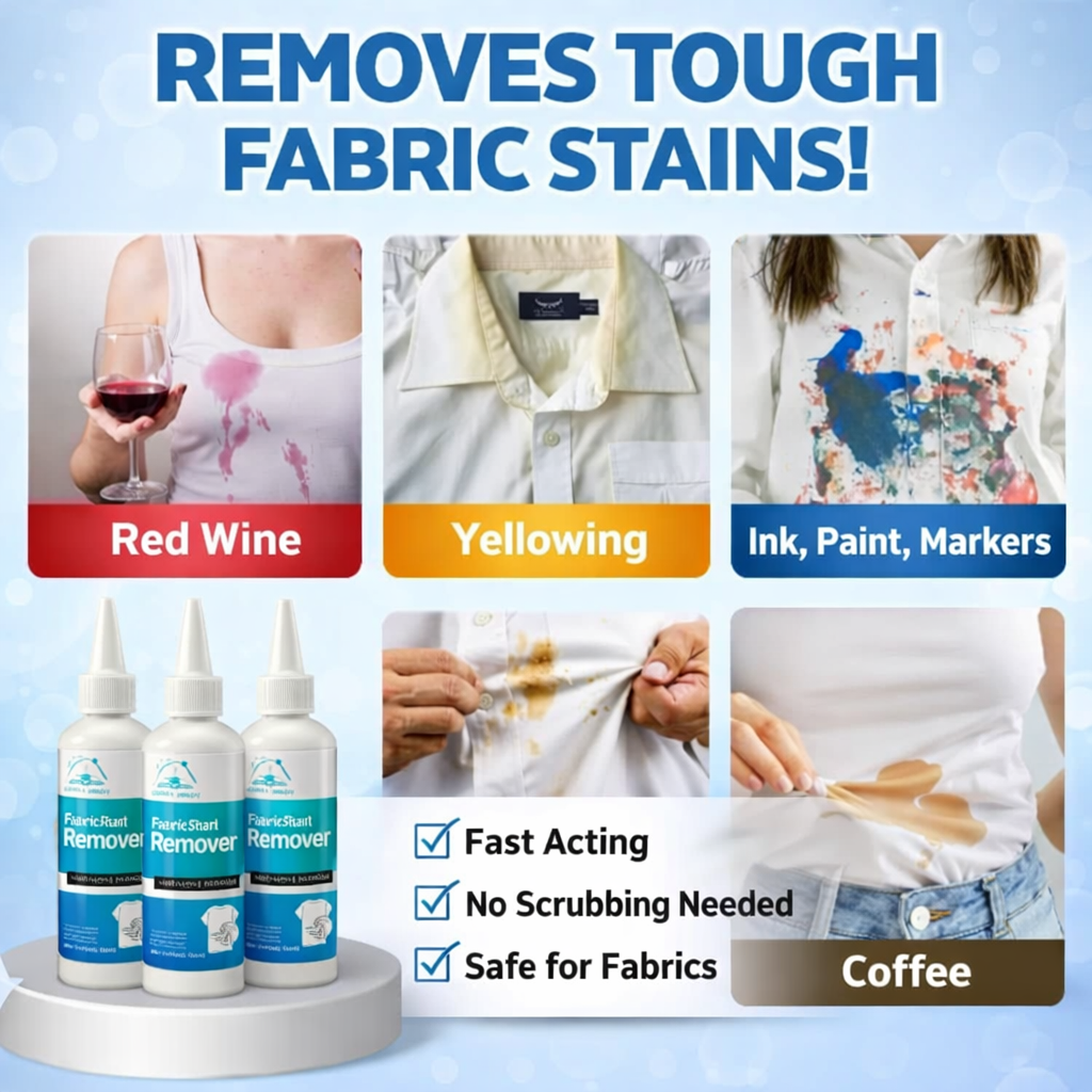 Our powerful stain remover works instantly to break down stubborn stains deep within fabric fibers, delivering faster and more effective results than ordinary cleaners. No more wasting time scrubbing or throwing away your favorite clothes — this advanced formula restores them to a clean, like-new look in seconds. Safe on all fabrics and gentle on your hands, it leaves no residue or damage behind. It’s the easiest way to save your clothes, your time, and your money while getting professional-level results right at home.